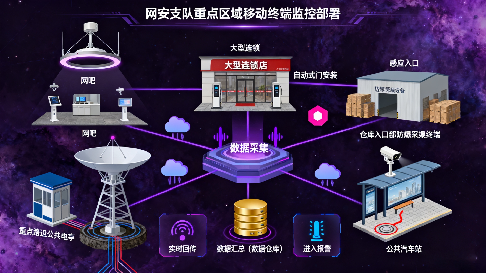 xx网安支队规划在全区的网吧、大型连锁门店、重点路段公共电话亭及公共汽车站等重点区域部署移动终端硬件特征采集设备,对区域内的移动终端设备进行监控。实现数据采集、实时回传、数据汇总(数据仓库)、进入报警及轨迹追踪等功能,为公安机关在公共 WIFI 管控工作中提供有力的抓手。